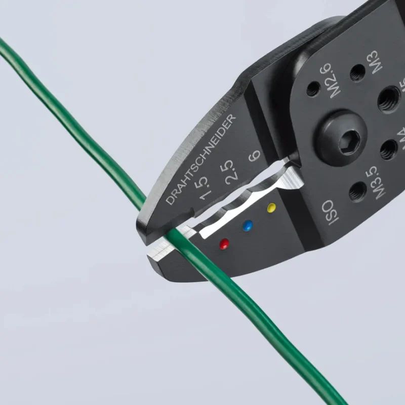 Replės kabelių kirpimui, vielos nužievinimui, užspausti izoliuotiems ir neizoliuotiems antgaliams ir kištukinėms jungtims 18-10 AWG. Turi skyles pjauti sriegiams varyje ir žalvaryje, dydžius M 2.6: 3.0: 3.5: 4.0 ir 5.0 mm. Pagaminta iš specialaus plieno.