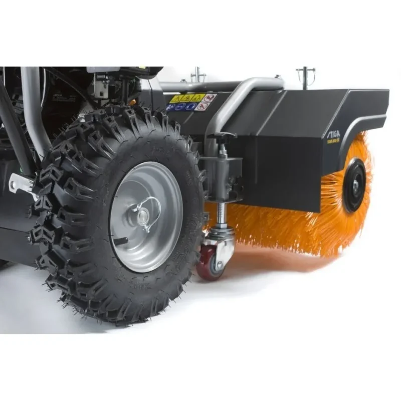 Stiga SWS 800 GE benzininė šlavimo mašina – tai visais metų laikais naudojamas įrenginys, galintis išvalyti negausų sniegą, smėlį, lapus, žolės likučius nuo beveik bet kokio paviršiaus. Naudojamas 80 cm. pločio nailoninių šerių šepetys, nesunkiai valdomas ergonomišku, patogiu svertu, kuris reguliuoja šepetį trimis skirtingomis pozicijomis (nuo 0° iki 15° į kairę ir į dešinę). Šepečio aukštis reguliuojamas dviem pasukamais ratukais, jį pakeliant ar nuleidžiant. Savaeigė, su elektriniu starteriu, varoma galingu 212 cm³ varikliu, vienos rankos valdymo sistema ir patogi ratų aukščio reguliavimo funkcija nereikalauja pastangų dirbant. Turi 6 pavaras į priekį ir 2 atgal, kurios lengvai perjungiamos naudojant svertą šalia rankenos. SWS 800 GE šlavimo mašinoje sumontuoti specialūs 14″ dydžio ratai bei patikimos žieminės „Snow Hog” padangos, užtikrinančios sukibimą su bet kokiu paviršiumi. Dėka šviesos diodų žibintų patogu dirbti ir tamsiu paros metu. Norint, kad šlavimo mašina būtų dar universalesnė, galima įsigyti papildomus priedus: sniego peilį bei rinktuvą (žr. susijusios prekės).