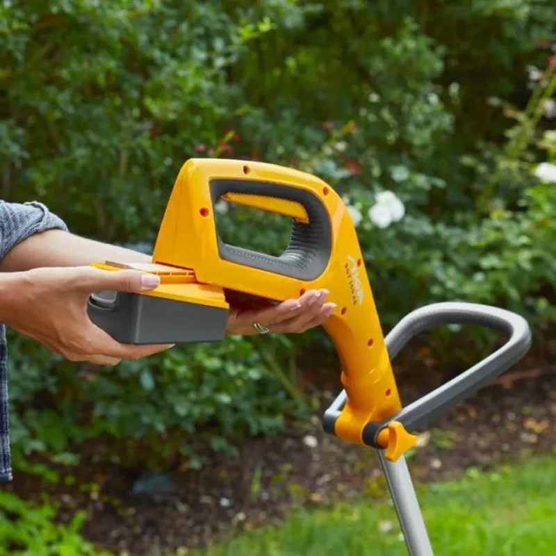 Naujosios 100-osios E-Power serijos trimeris tai optimaliai subalansuotas įrankis, puikiai tinkantis vejos pakraščių apipjovimui. Kilpinė rankena ir teleskopinis velenas, su greito atlaisvinimo funkcija, leidžia pasirinkti geriausią ilgį, kad būtų optimalus komfortas dirbant. Dviejų mygtukų paspaudimo sistema, kuri įjungia įrenginį tik nuspaudus apsauginį jungiklį, taip siekiant apsaugoti ir nuo netyčinio įjungimo. Šio tyliai veikiančio trimerio pjovimo plotis siekia iki 25 cm., o 45° pjovimo kampu pasikreipiančia galvute nupjausite sunkiau prieinamas vietas. Vienu paspaudimu ir galvutės pasukimu, įprastas žolės pjovimas pakeičiamas į pakraščių dailinimą, tai suteikia galimybę pjauti vertikalioje, 90° kampo, padėtyje, pvz.: prie pat tvoros esančią žolę. Automatiškai paduodama gija suteikia greitą ir nepertraukiamą pjovimą. Praktiškas apsauginis lankelis, saugo nuo galimų pažeidimų pjaunant apie medžius ir krūmus. Ergonomiškas jungiklis įmontuotas rankenoje, patogiam valdymui ir saugumui užtikrinti. Su pilnai įkrautu 20V – 2,0 Ah akumuliatoriumi pjauti galėsite net iki 20 min.